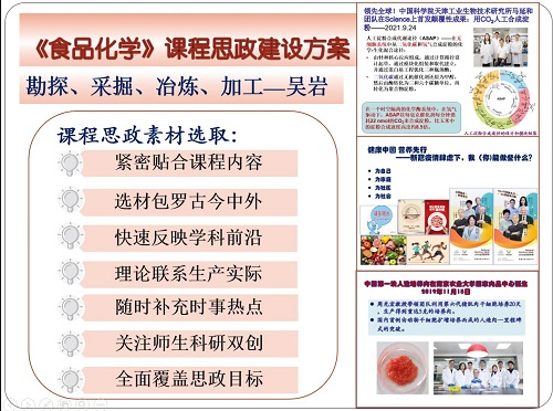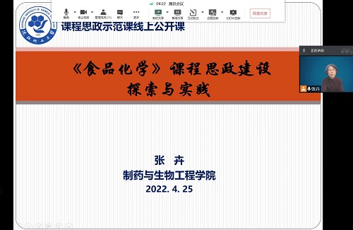 4月25日下午,校级课程思政示范课云端公开课第十讲正式开课。制药与生物工程学院张卉老师结合《食品化学》课程进行了课程思政建设经验分享和案例展示。《食品化学》课程是食品科学与工程专业的基础课程和核心课程,2020年该门课程获批校级“课程思政示范课程”“省级一流本科课程”。